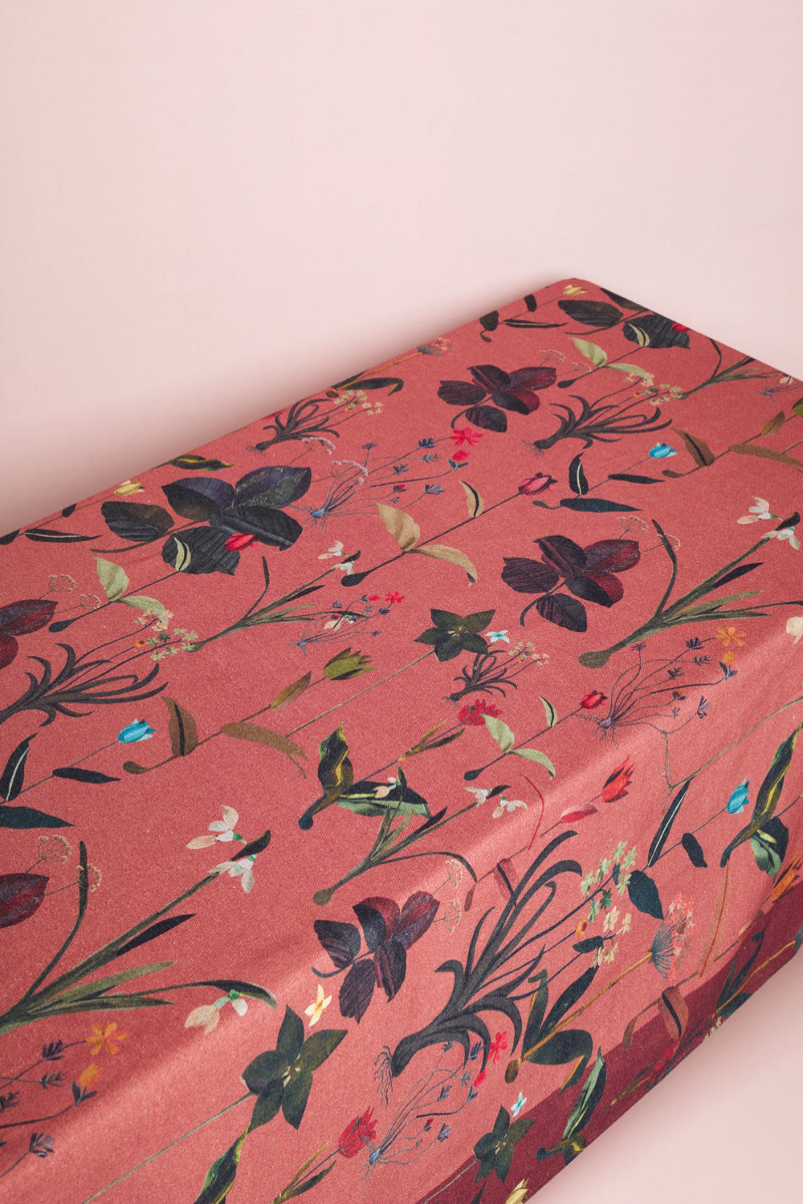 Mantel estampado "Bulbos Teja" en lino y algodón.