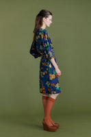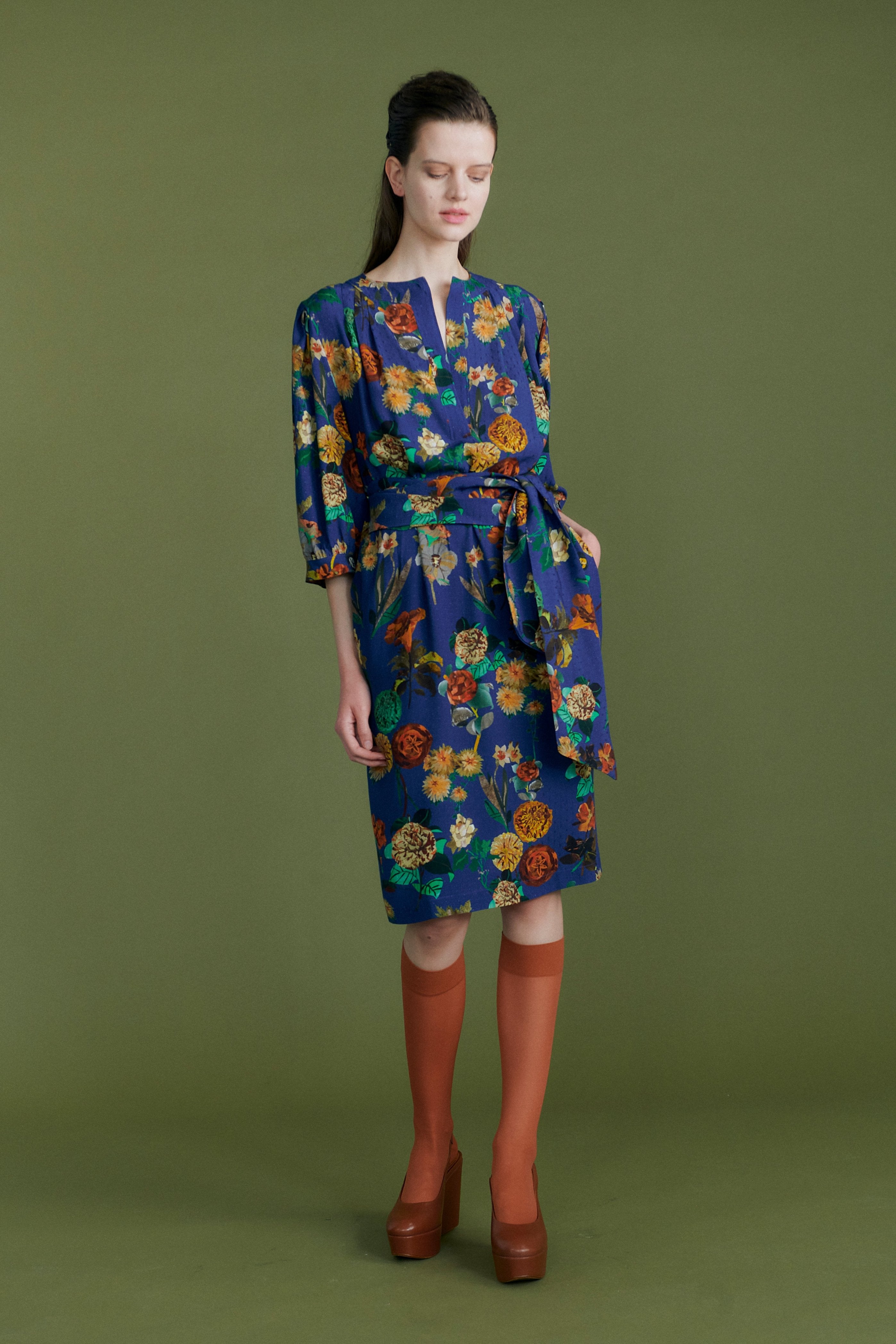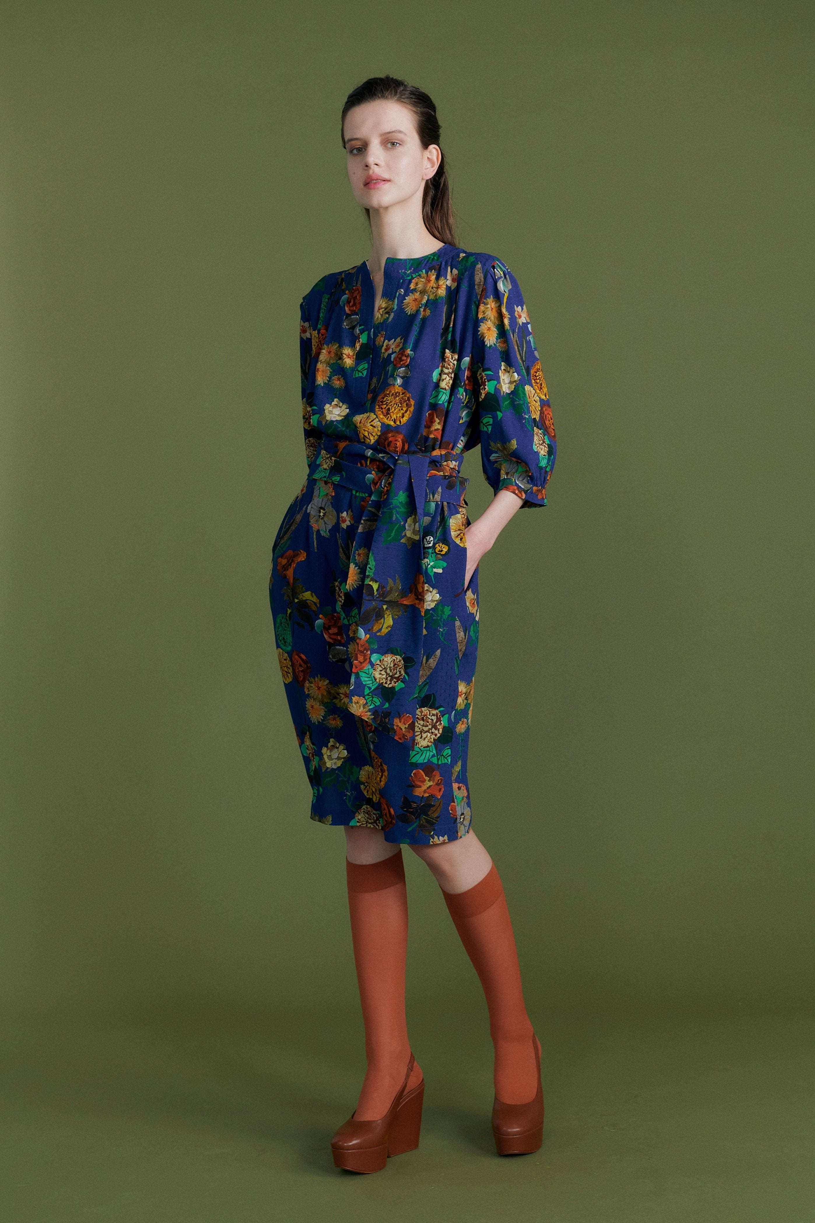 El estampado "Floral" está realizado en la técnica del collage, disponiendo y pegando diferentes recortes de papeles con acabado brillante, en sus diferentes combinaciones de colores. Composiciones florales diseminadas en las texturas de cada tejido. Voluptuosas guirnaldas de camelias, narcisos, peonías, pensamientos y crisantemos, distribuidos sobre un fondo negro, rojo teja y azul oscuro, haciendo referencia a la austera y teatral pintura floral del Siglo de Oro neerlandés y español.