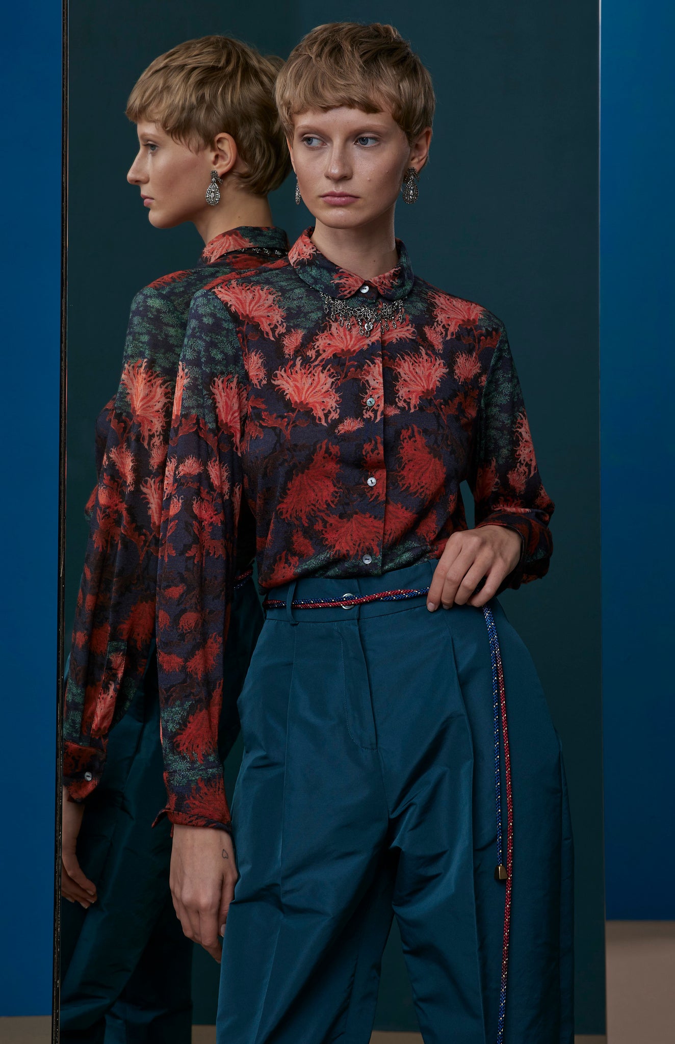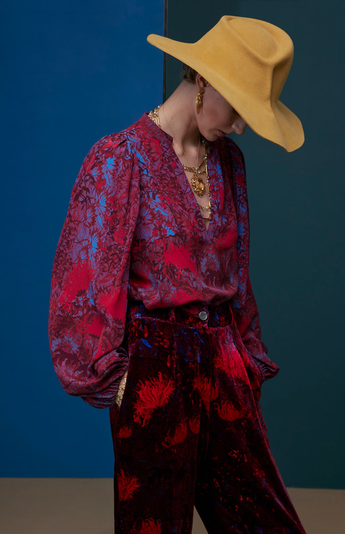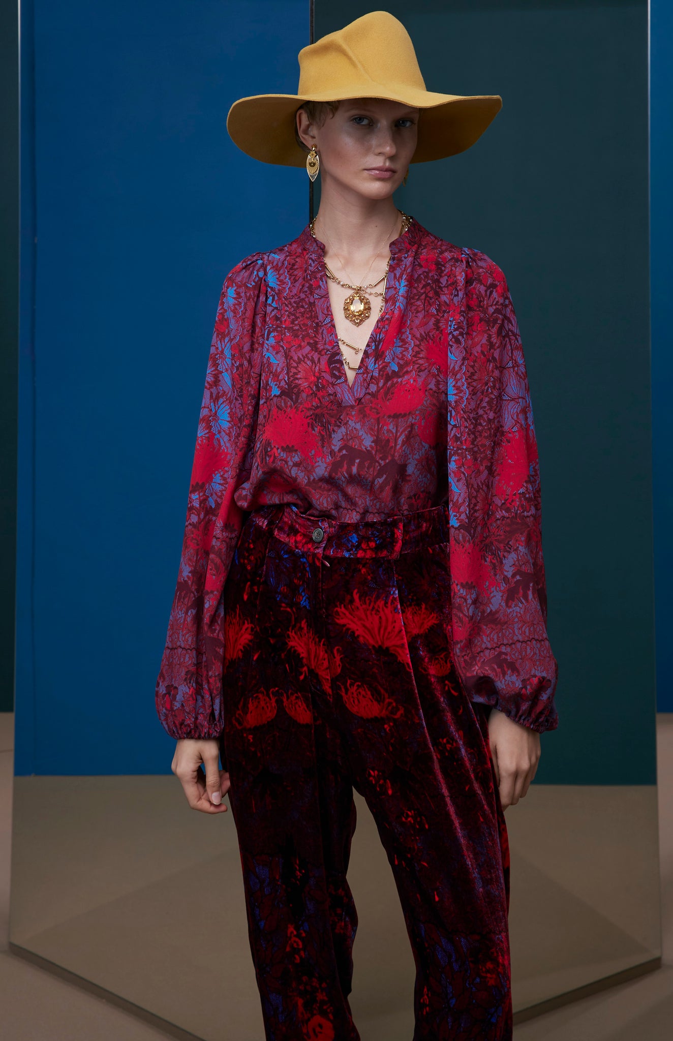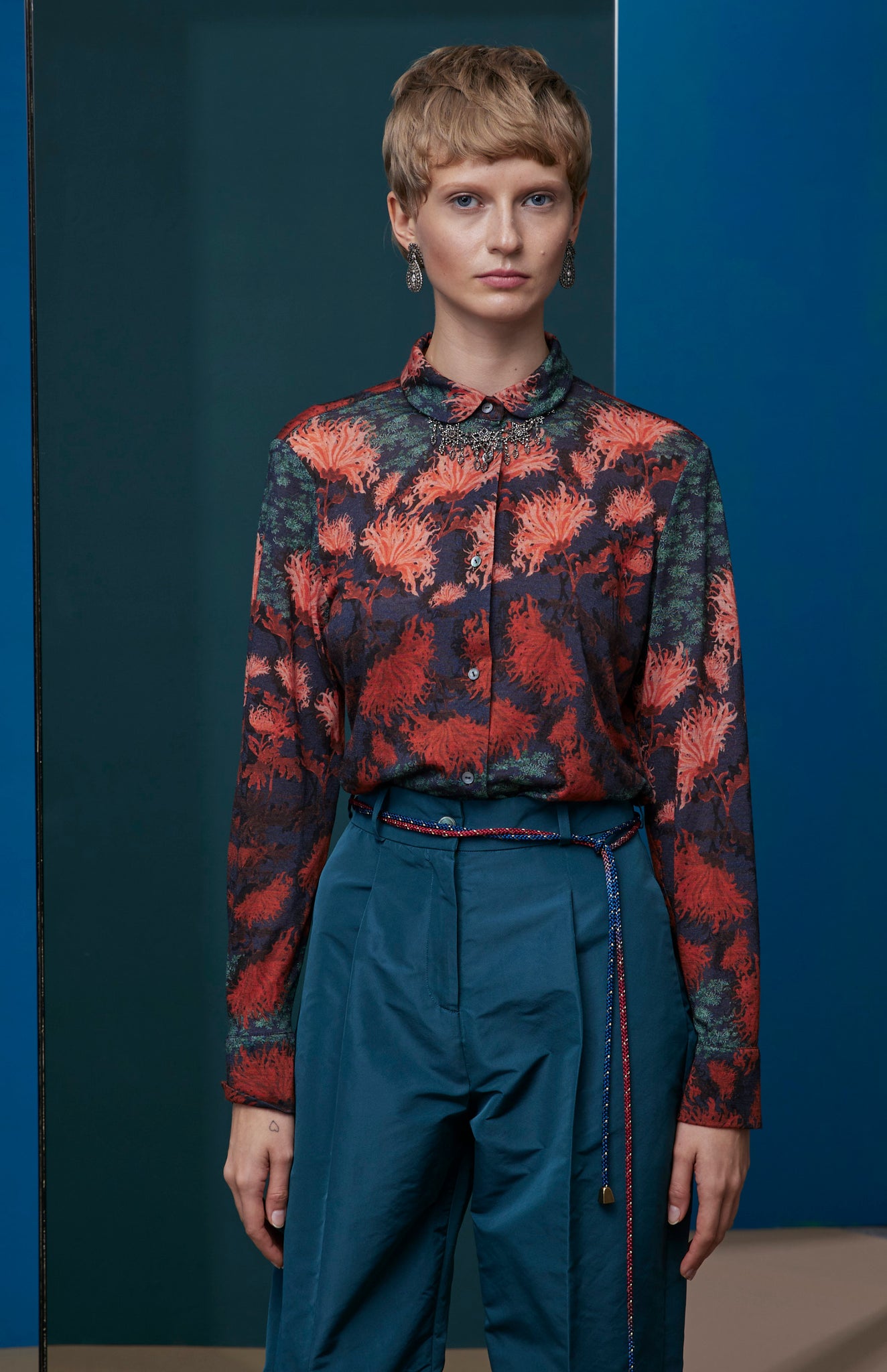 FW25-B014Red. Blusa escote pico estampado “Crisantemos”