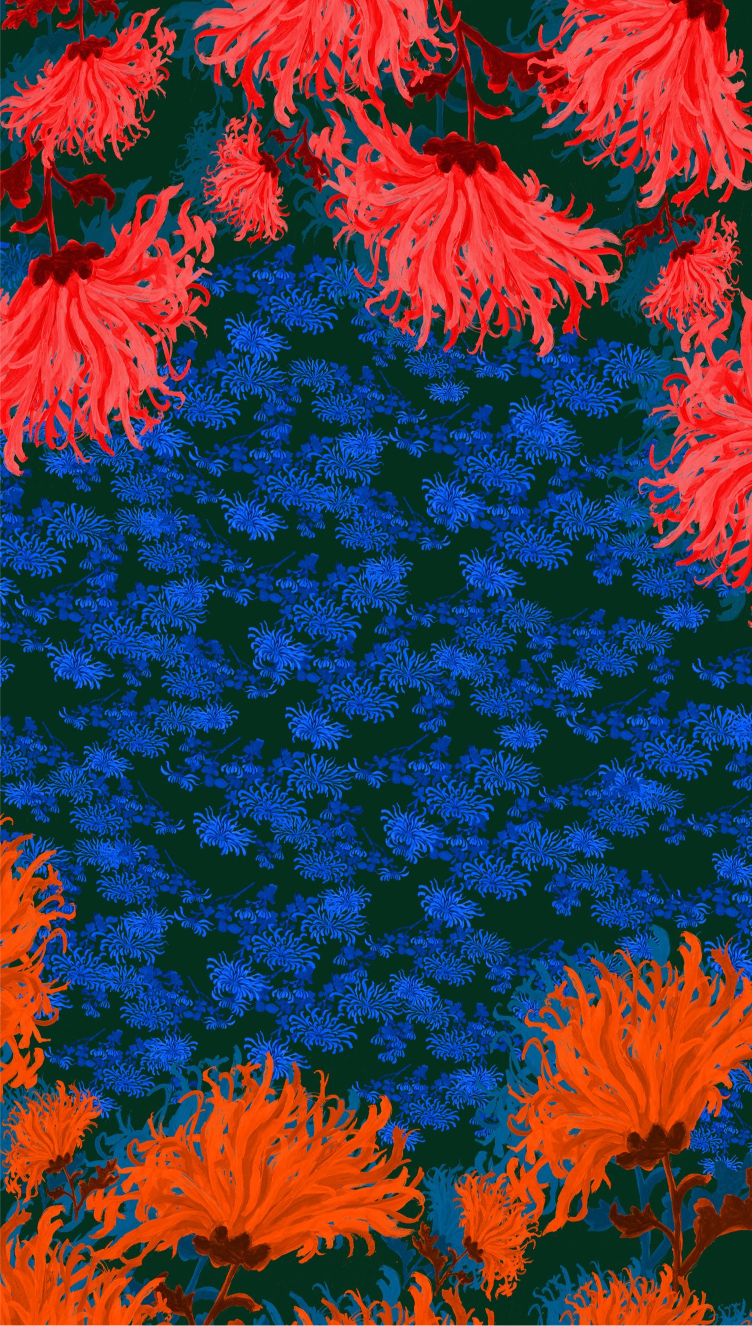 Un conjunto de crisantemos, en primer plano y pintados en tono sobre tono, se representan sobre un fondo monocromo de las mismas flores.