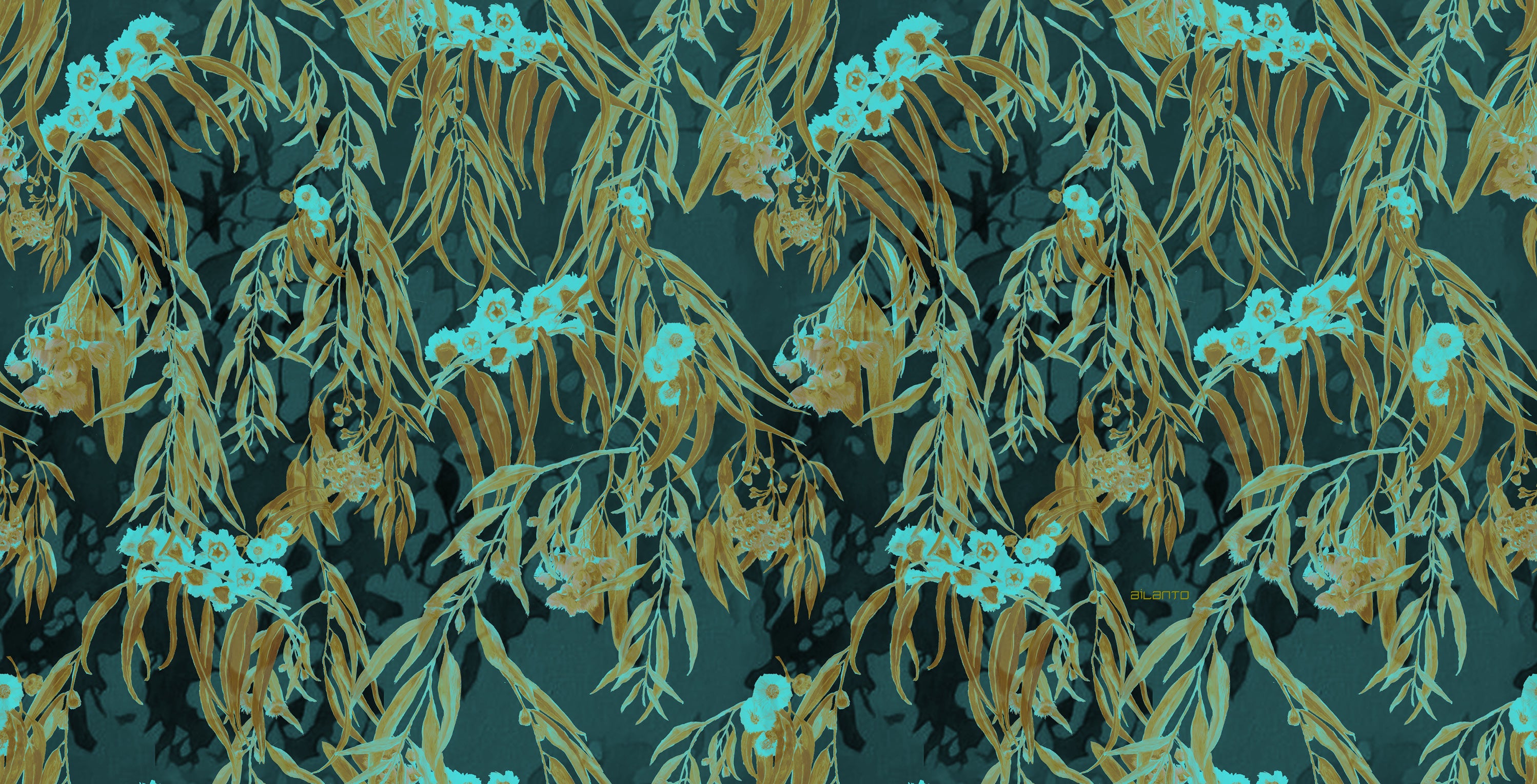 El estampado "Eucaliptos" es una composición de diversos dibujos de hojas y flores de eucalipto. Las inflorescencias agrupadas en forma de umbelas y sus hojas lanceoladas proyectan sombras sobre un fondo de color compacto.