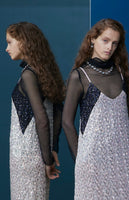 Blusa en gasa de seda negra con pinzas y corte ajustado al cuerpo.