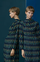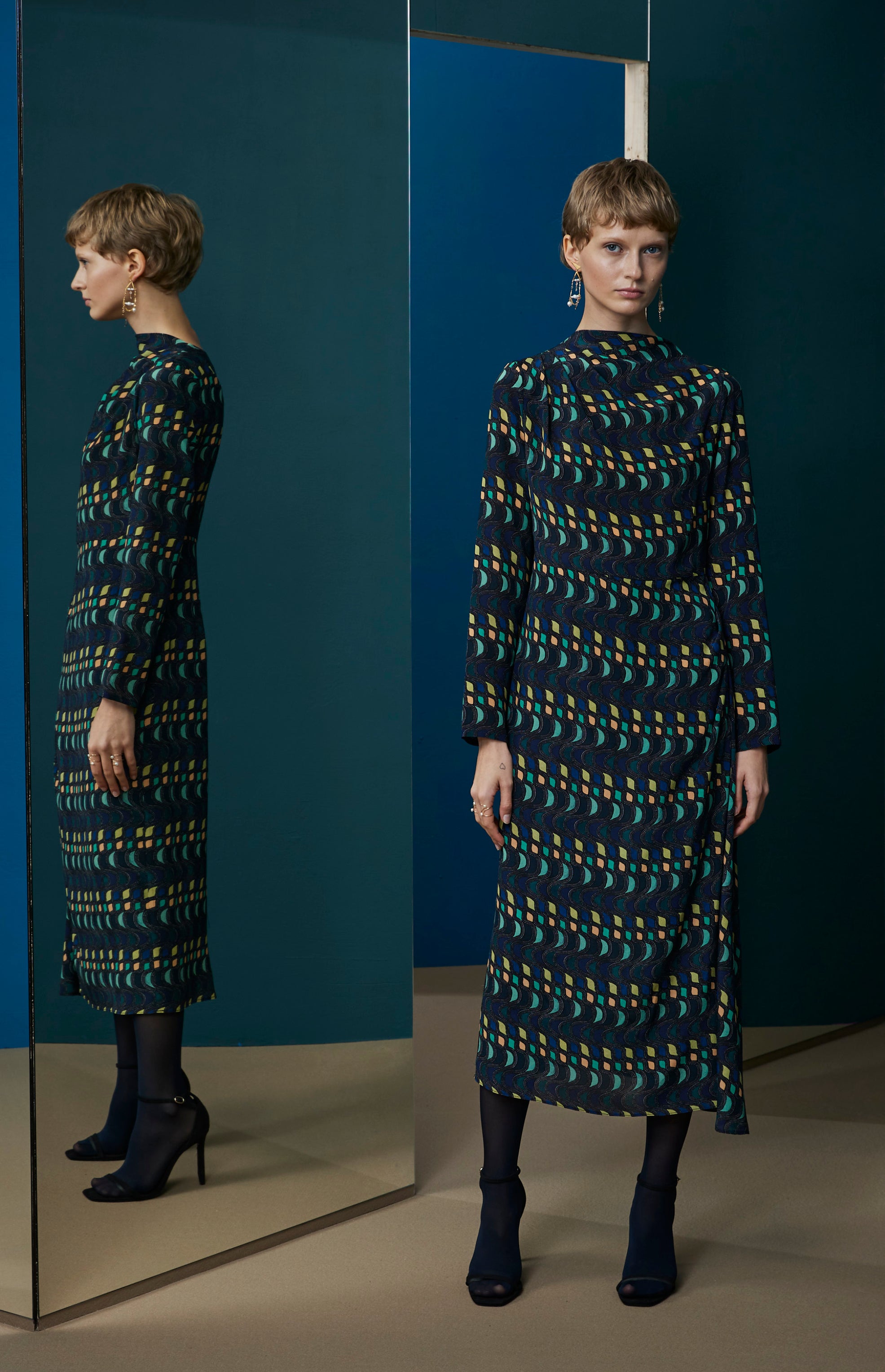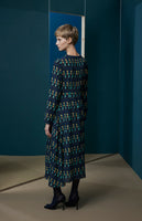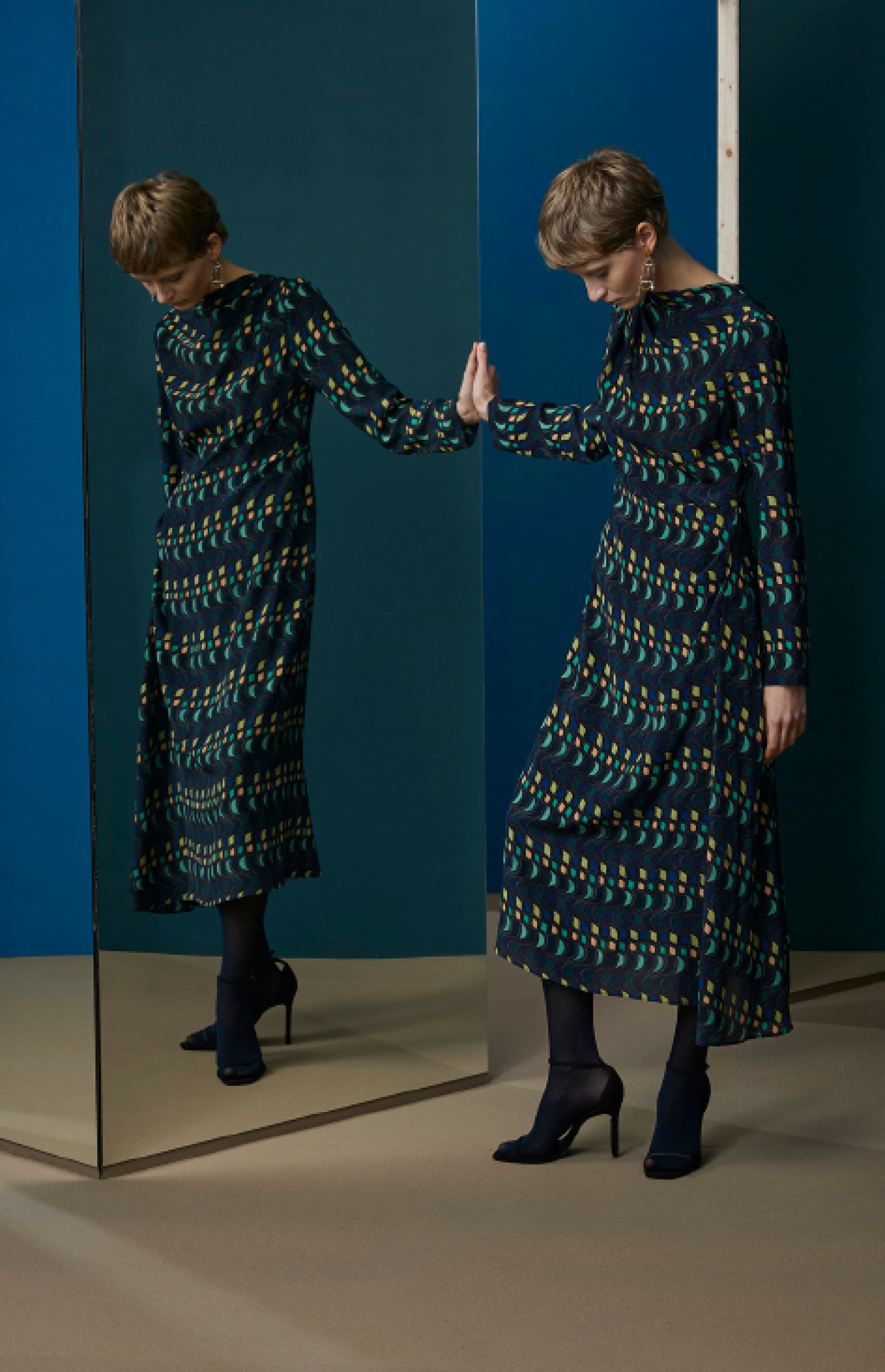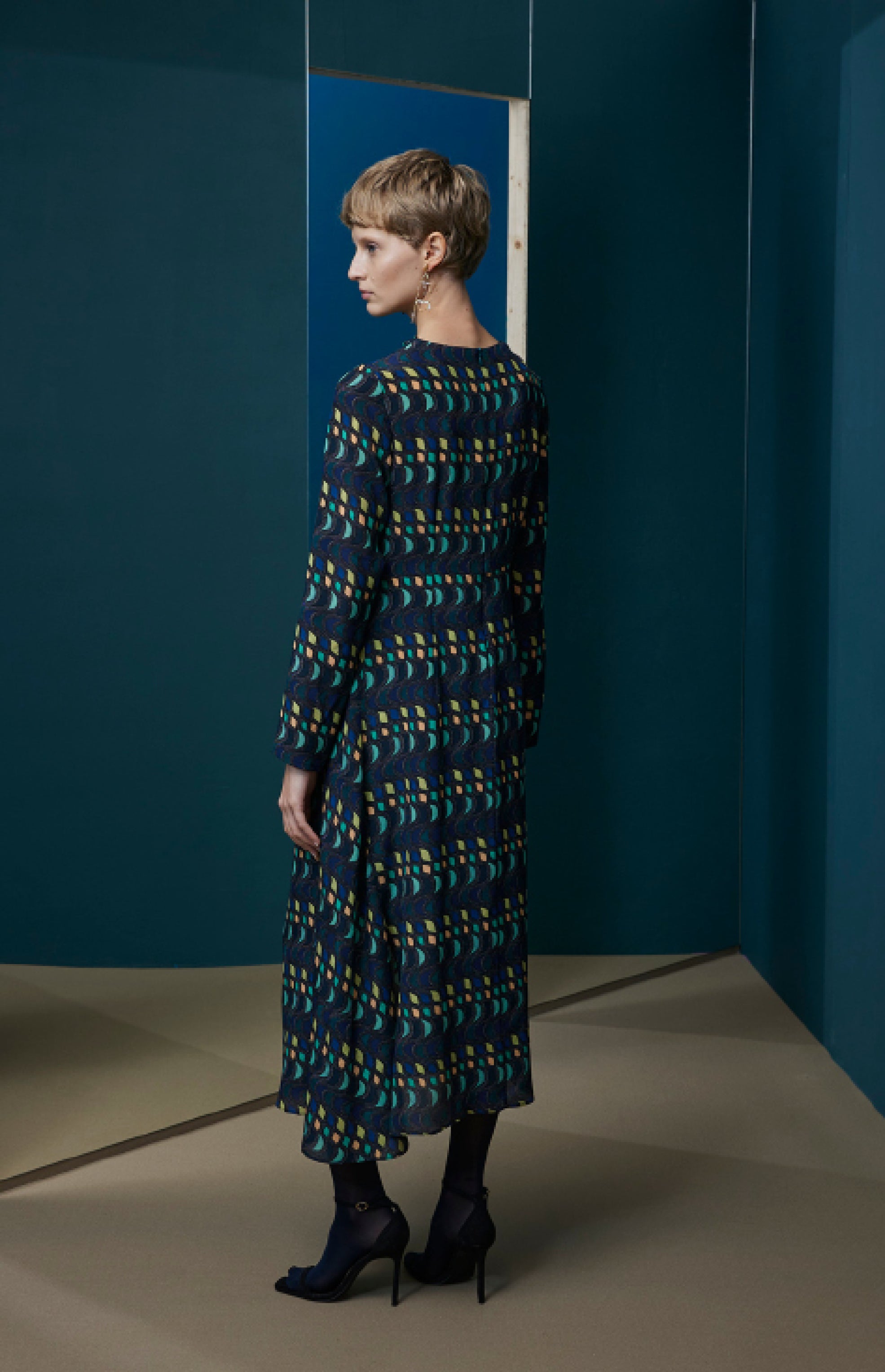 El estampado ¨Geométrico " es una sucesión de figuras lanceoladas en una composición rítmica, construida a través de alternancia de elementos. Colores apagados yuxtapuestos a colores vibrantes sobre un fondo neutro.