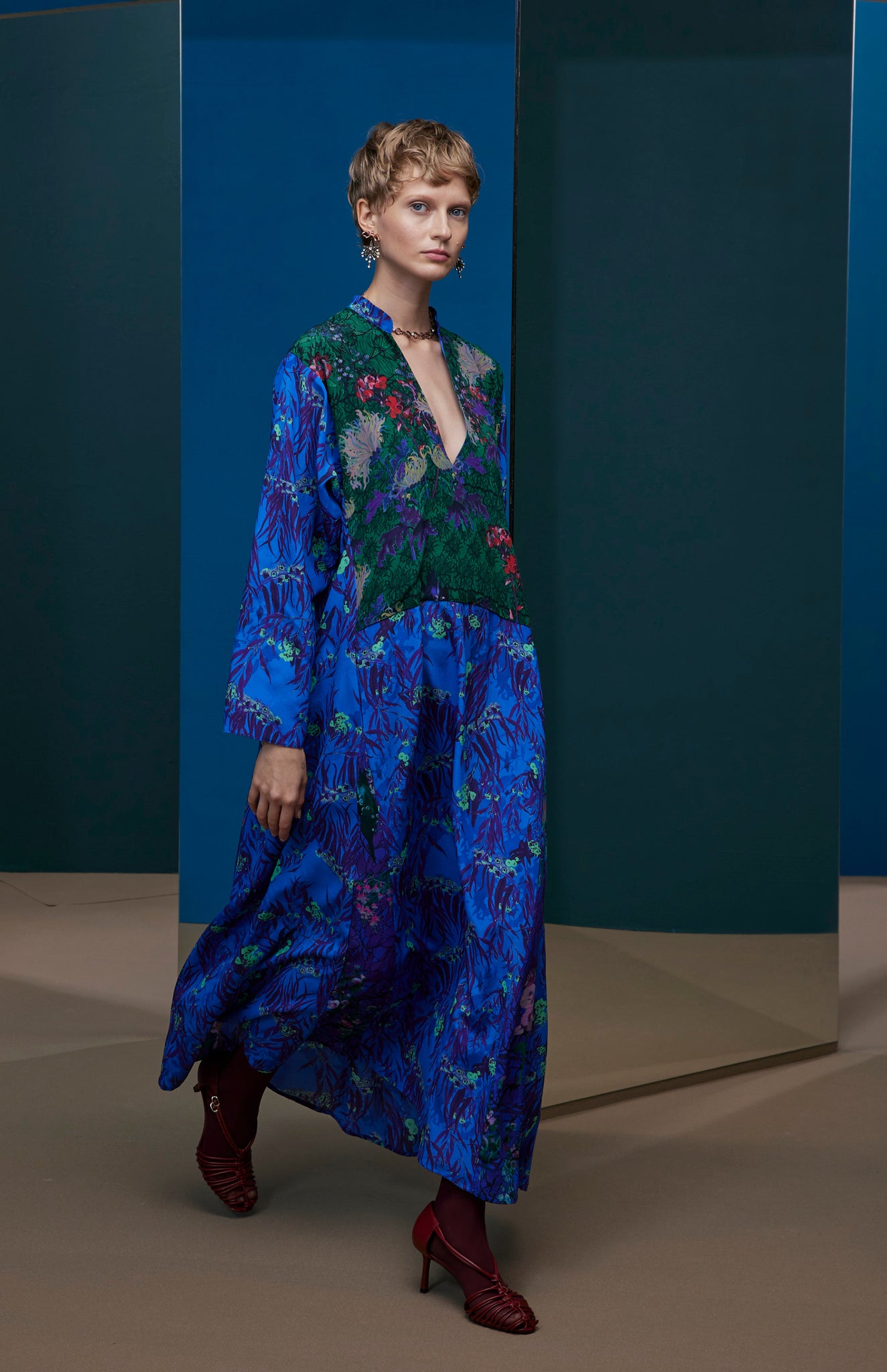 FW25-V010 Vestido largo de pliegues estampado "Floral sobre encaje"