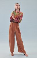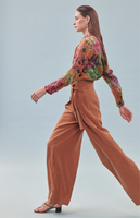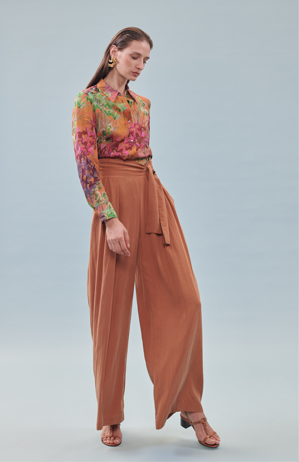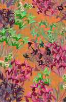 El estampado "Campo de tulipanes" está realizado en la clásica técnica de pintura sobre seda, dibujando las reservas con resina y aplicando los colores especiales para seda diluidos en agua.