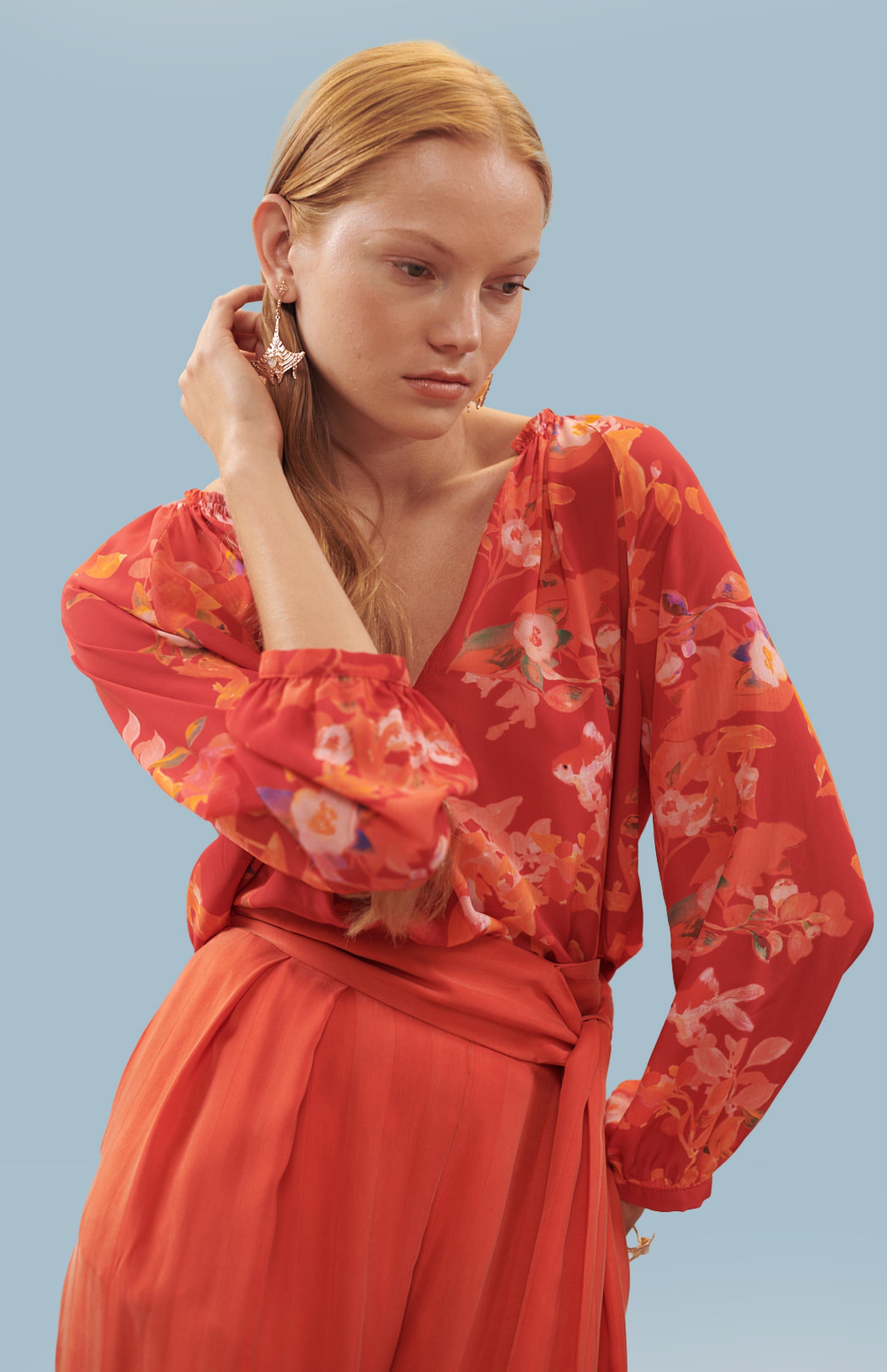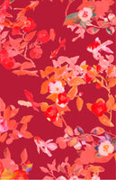 El estampado está realizado en la técnica pictórica de la témpera sobre cartulina representando un grupo de peces dorados que se mezclan con el reflejo de las flores de los arbustos de camelia en el agua.