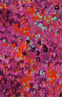 El estampado "Campo de tulipanes" está realizado en la clásica técnica de pintura sobre seda, dibujando las reservas con resina y aplicando los colores especiales para seda diluidos en agua.